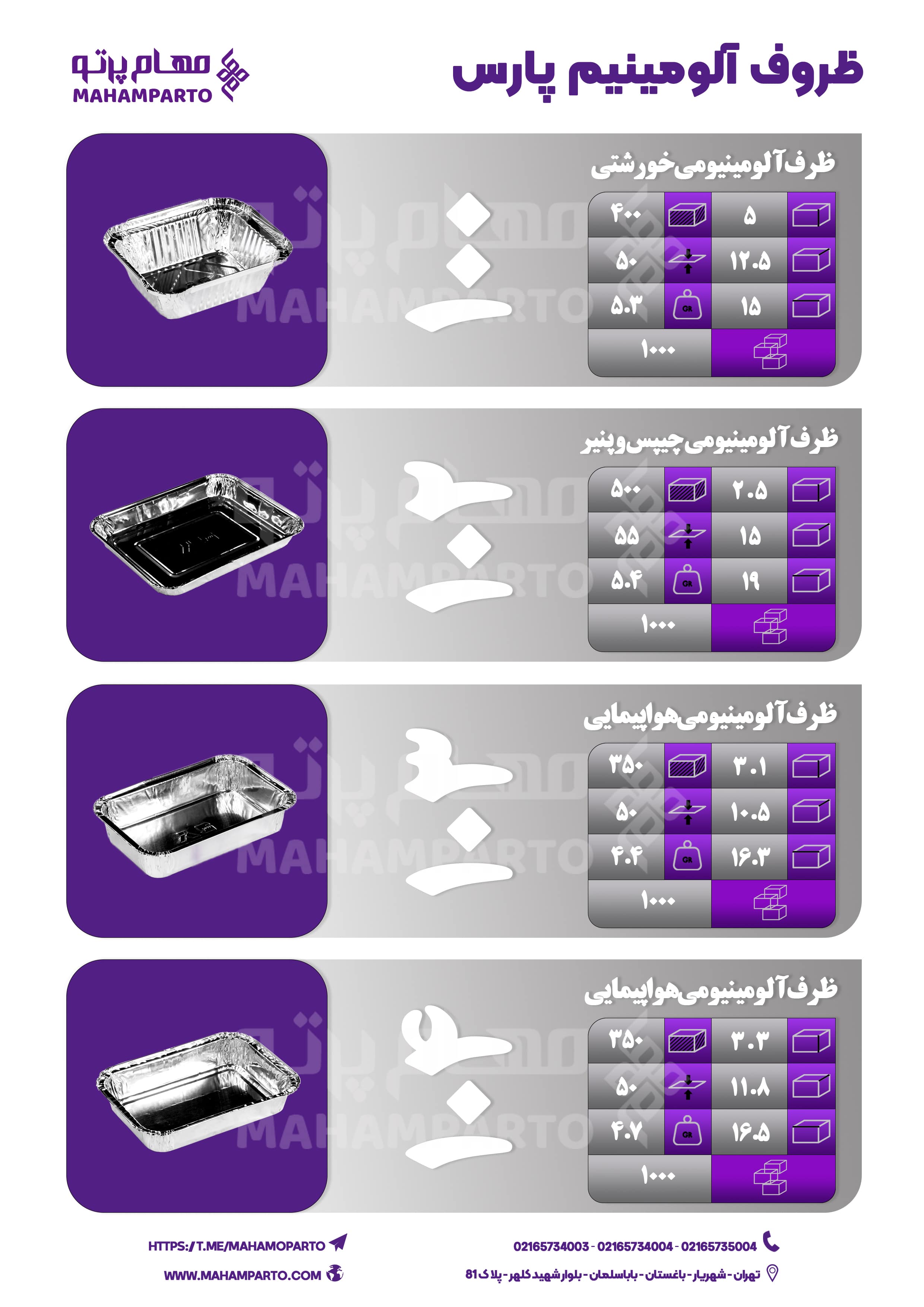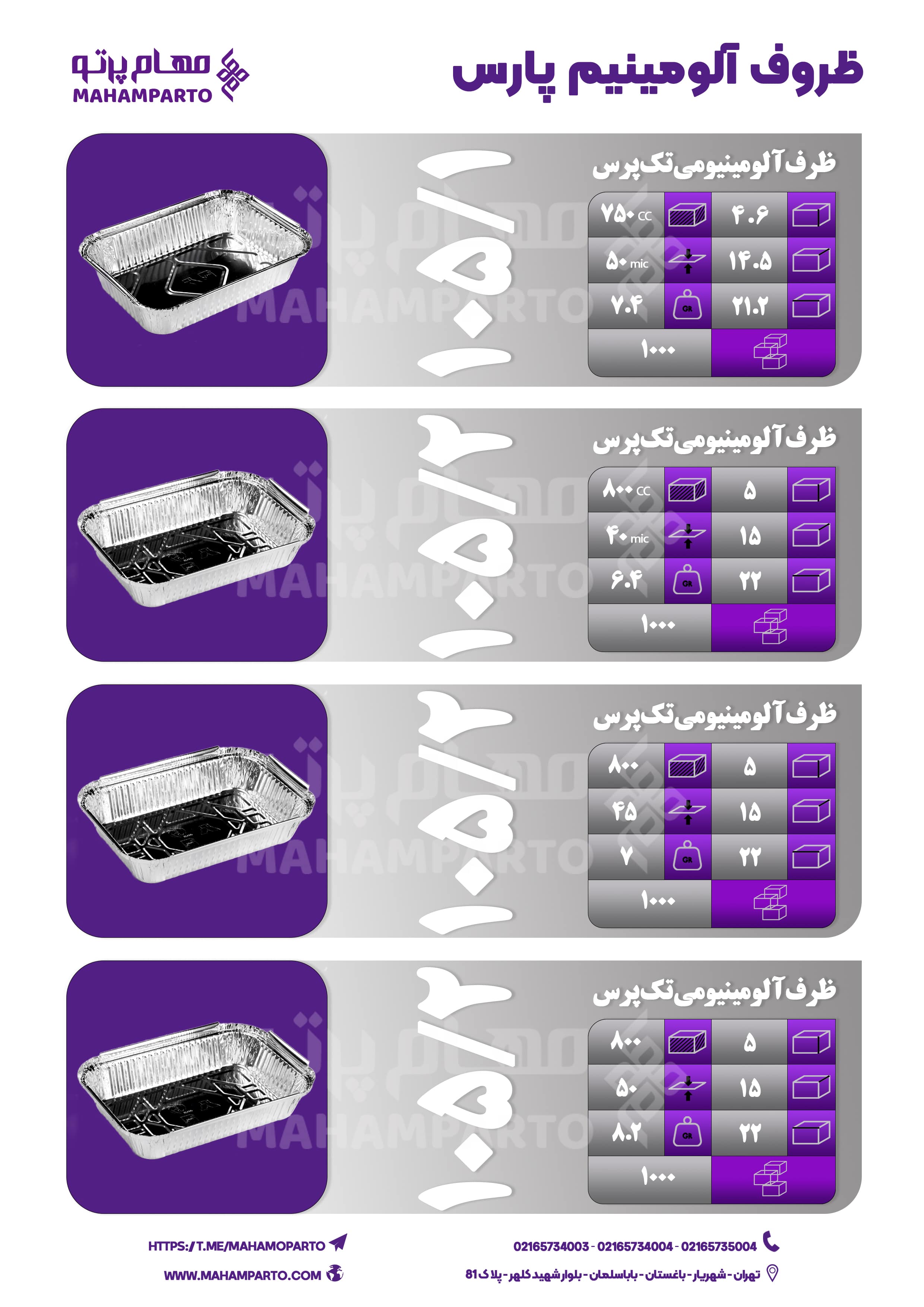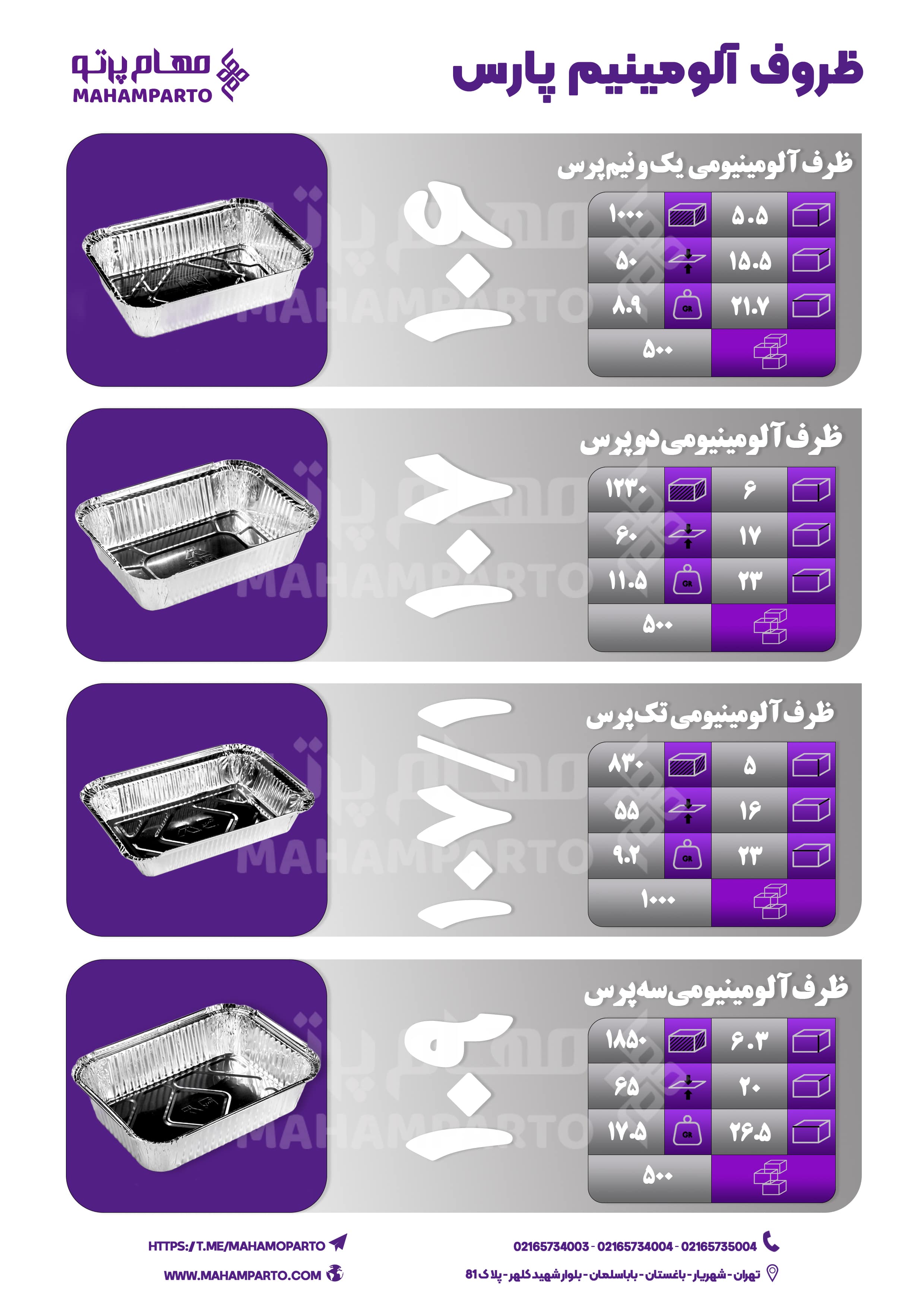 ظروف آلومینیومی برخلاف مابقی ظروف یکبارمصرف قیمت به روز خود را دارند و هر روز در حال تغییر میباشند به دلیل اینکه مواد اولیه (شمش آلومینیومی) با قیمت جهانی در حال تغییر میباشد که این موجب نوسانات در بازار شده و برای خرید و فروش این ظروف باید با شرکت های پخش کننده تحت نماینده فروش کارخانه ها تماس گرفت. جهت استعلام قیمت ظروف یکبارمصرف آلومینیومی برند های آلومینیوم پارس، پارسیدا سیمین، هیرو بان، پارس نوین و امیرکو می توانید با نماینده فروش این کارخانه ها تماس بگیرید که مهام پرتو پخش کننده رسمی این شرکت ها است شما میتوانید قیمت بروز این ظروف آلومینیومی را از این شرکت استعلام کنید.