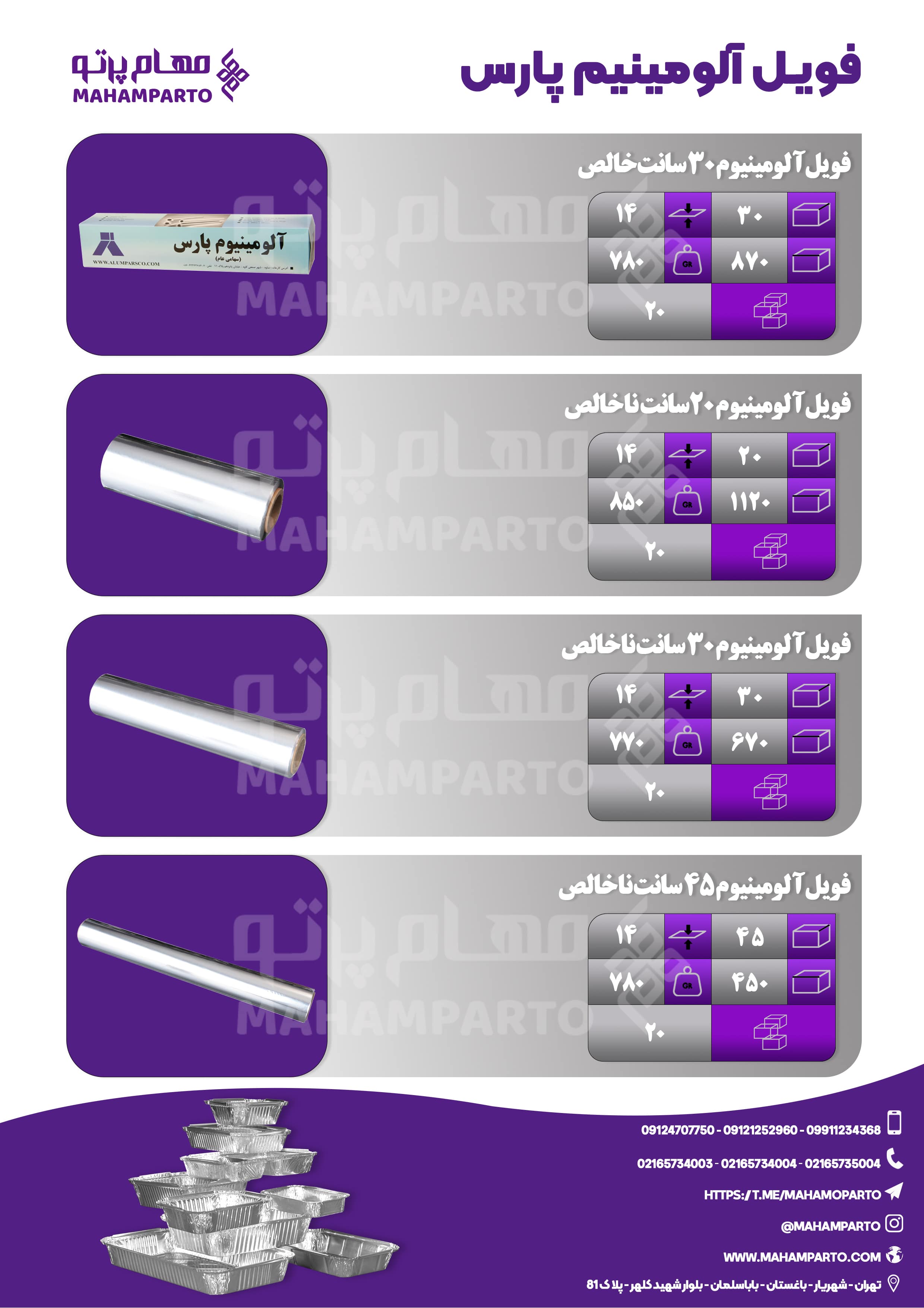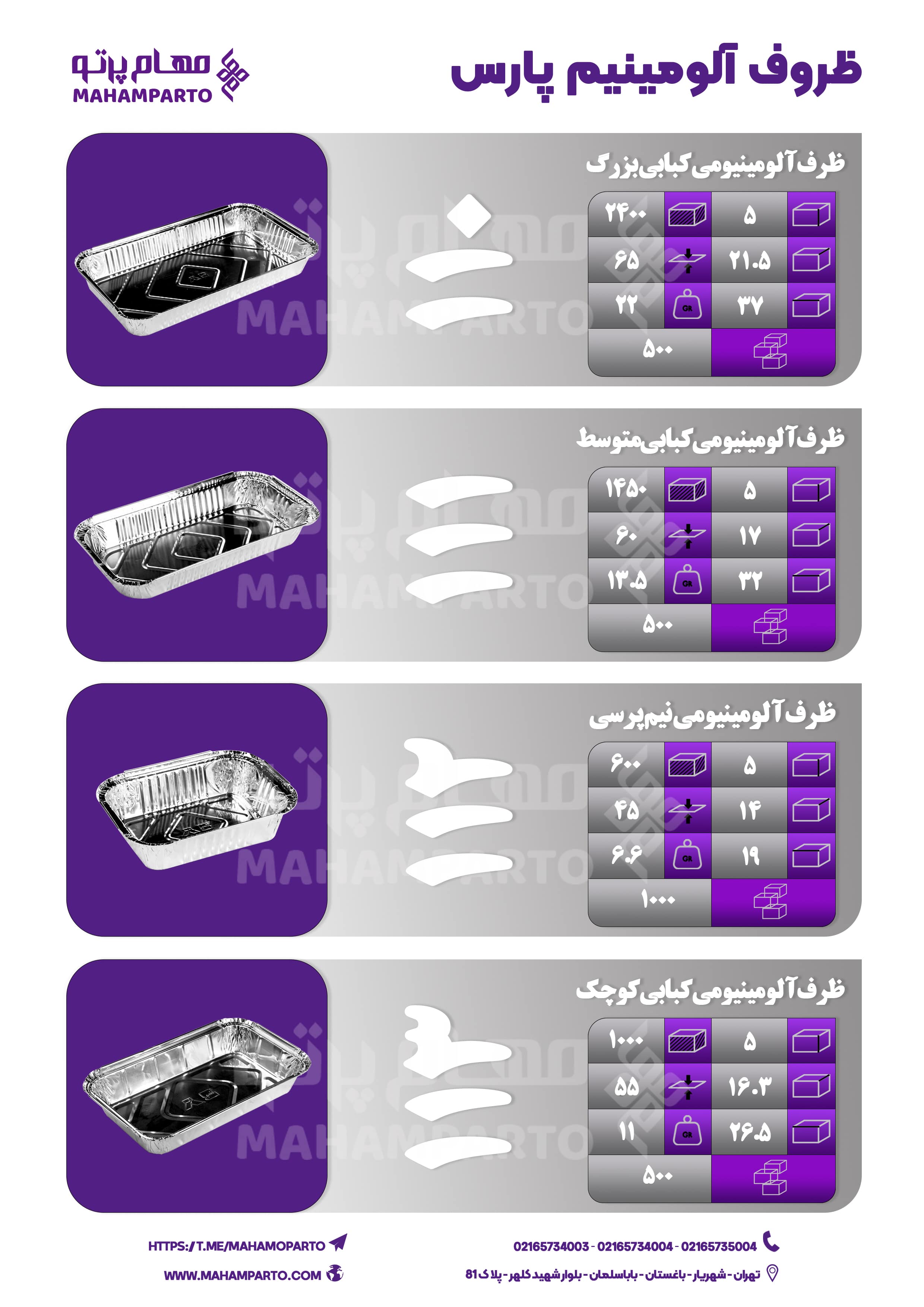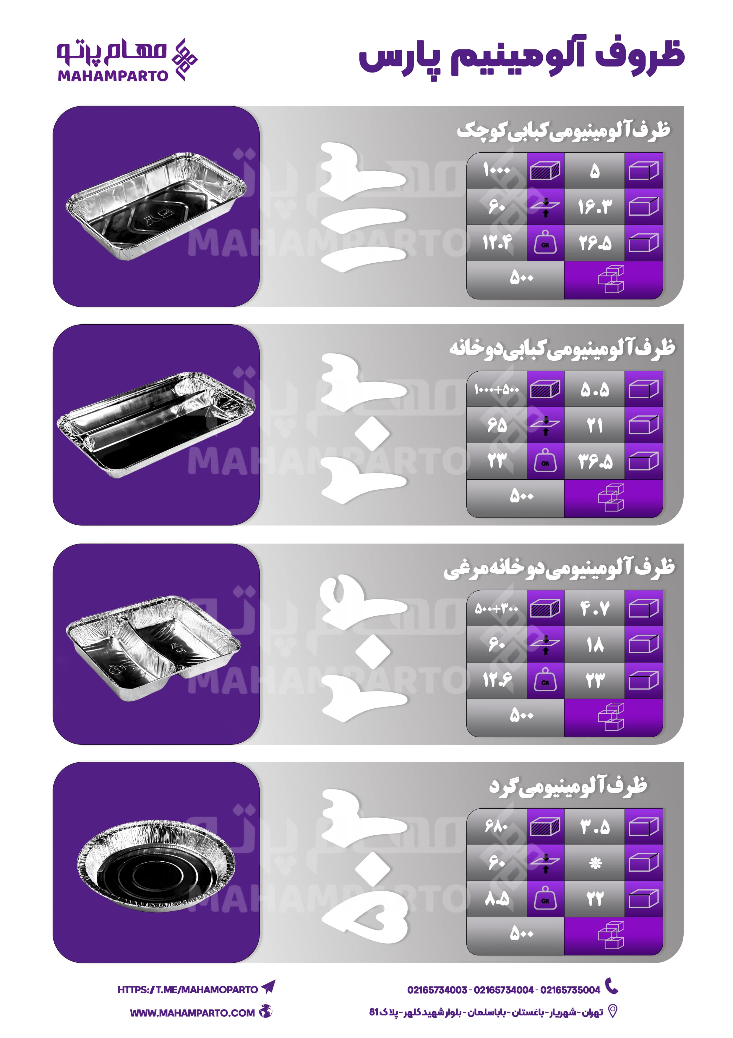 ظروف آلومینیومی برخلاف مابقی ظروف یکبارمصرف قیمت به روز خود را دارند و هر روز در حال تغییر میباشند به دلیل اینکه مواد اولیه (شمش آلومینیومی) با قیمت جهانی در حال تغییر میباشد که این موجب نوسانات در بازار شده و برای خرید و فروش این ظروف باید با شرکت های پخش کننده تحت نماینده فروش کارخانه ها تماس گرفت. جهت استعلام قیمت ظروف یکبارمصرف آلومینیومی برند های آلومینیوم پارس، پارسیدا سیمین، هیرو بان، پارس نوین و امیرکو می توانید با نماینده فروش این کارخانه ها تماس بگیرید که مهام پرتو پخش کننده رسمی این شرکت ها است شما میتوانید قیمت بروز این ظروف آلومینیومی را از این شرکت استعلام کنید.